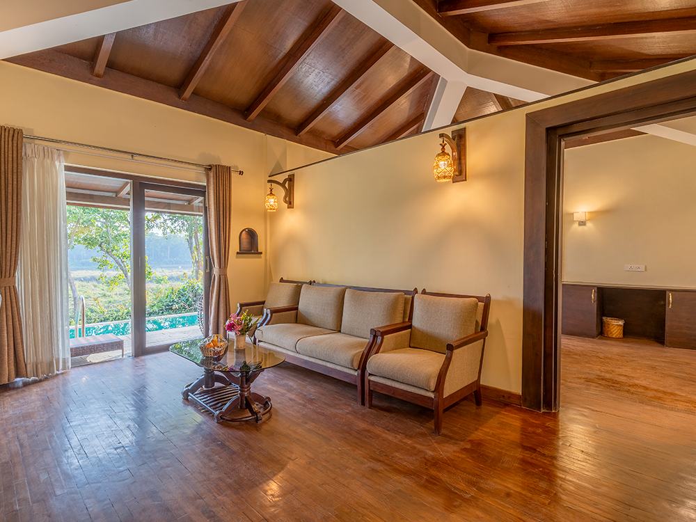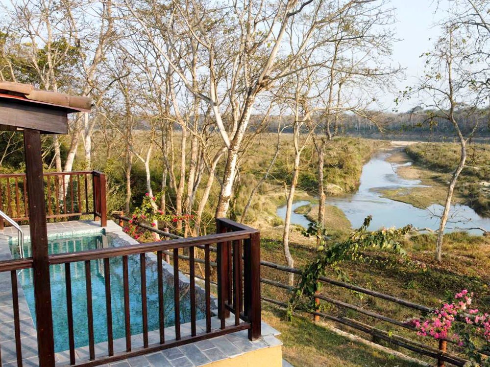 Nestled along the Rapti River, Jungle Villa Resort is a tranquil haven surrounded by greenery and thriving wildlife.
